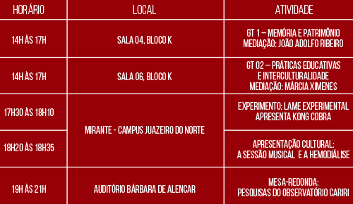 A programação do evento está disponível abaixo, iniciando na segunda (04/11) com uma conferência de abertura com o escritor e historiador Durval Muniz e se encerrando com as apresentações artísticas dos grupos: Na base da Chinela, Cômodo Marfim, Madalena Vinil e Navidon.