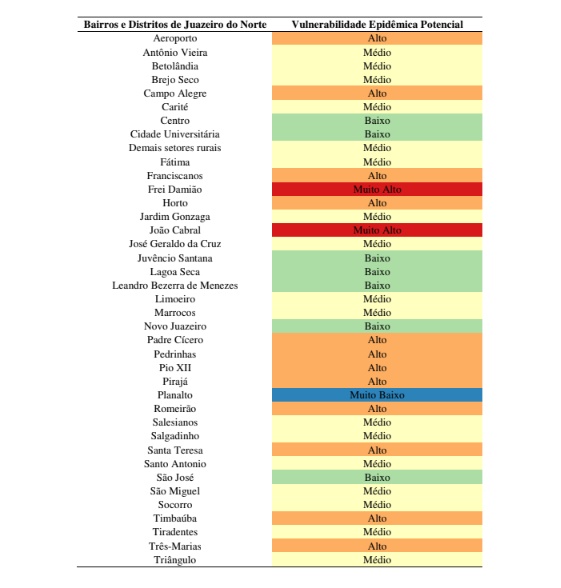Após a análise, os pesquisadores concluíram que os bairros Frei Damião e João Cabral, em Juazeiro do Norte, tem vulnerabilidade epidêmica “muito alta” para o novo coronavírus. O único bairro com vulnerabilidade “muito baixa” é o Planalto. Bairros como Pirajá, Romeirão, Timbaúba, Pio XII e Campo alegre estão classificados com potencial “alto”. imagem: reprodução/ Pesquisa sobre Vulnerabilidade Epidêmica Potencial de Covid (IFCE)Em Crato, foram classificados com risco “muito alto” os bairros França Alencar, Monte Alverne e Santa Fé. Como “muito baixo” estão o Granjeiro, Mirandão, Pimenta e Sossego. imagem: reprodução/ Pesquisa sobre Vulnerabilidade Epidêmica Potencial de Covid (IFCE)Em Barbalha, o Caldas e a Mata dos Limas estão no índice mais preocupante. No município, não há bairros classificados com risco “muito baixo”. imagem: reprodução/ Pesquisa sobre Vulnerabilidade Epidêmica Potencial de Covid (IFCE)Veja o relatório completo da pesquisa clicando aqui.