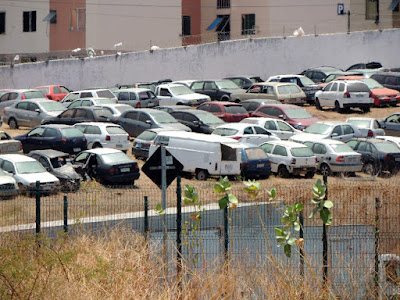 Veículos espalhados pelo pátio do Detran, carros, motos, caminhões, ônibus e outros veículos se deterioram sob sol e chuva.
