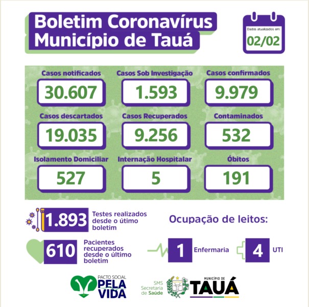 Os casos de Covid no município de Tauá continuam aumentando. Nas primeiras horas desta quarta-feira (02), a Secretaria de Saúde atualizou o Boletim Epidemiológico, apontando que 532 pessoas estão infectadas. São 219 novos casos desde o boletim anterior divulgado no último dia 25 de janeiro.